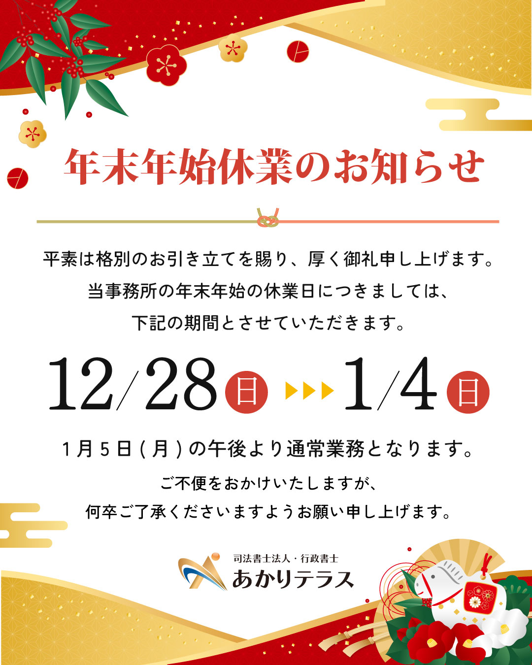 当事務所の年末年始の休業期間は下記の通りとさせていただきます。